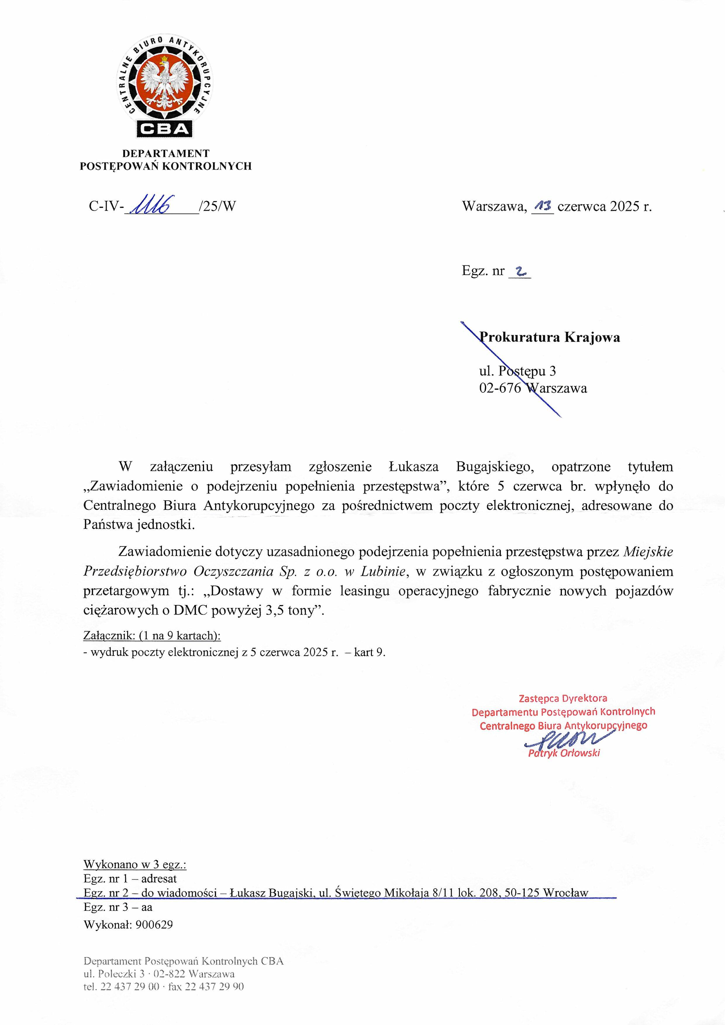 Pismo Zastępcy Dyrektora Departamentu Postępowań Kontrolnych CBA Patryka Orłowskiego przesyłające zgłoszenie Bugajskiego do Prokuratury Krajowej. Zawiadomienie dotyczy podejrzenia popełnienia przestępstwa przez Miejskie Przedsiębiorstwo Oczyszczania Sp. z o.o. w Lubinie w związku z przetargiem na leasing pojazdów ciężarowych o DMC powyżej 3,5 tony. Załącznik: wydruk e-mail z 05.06.2025, 9 kart.