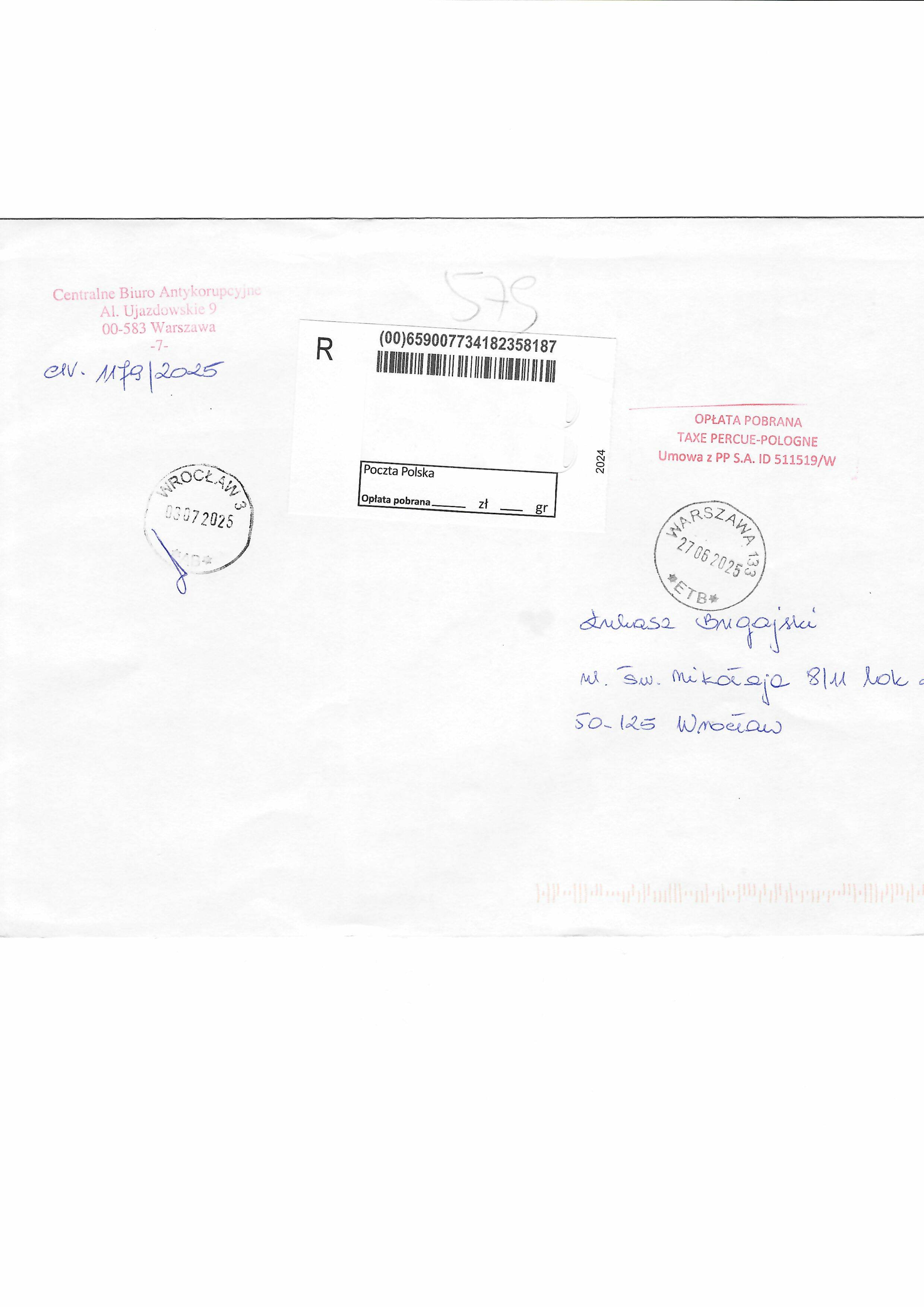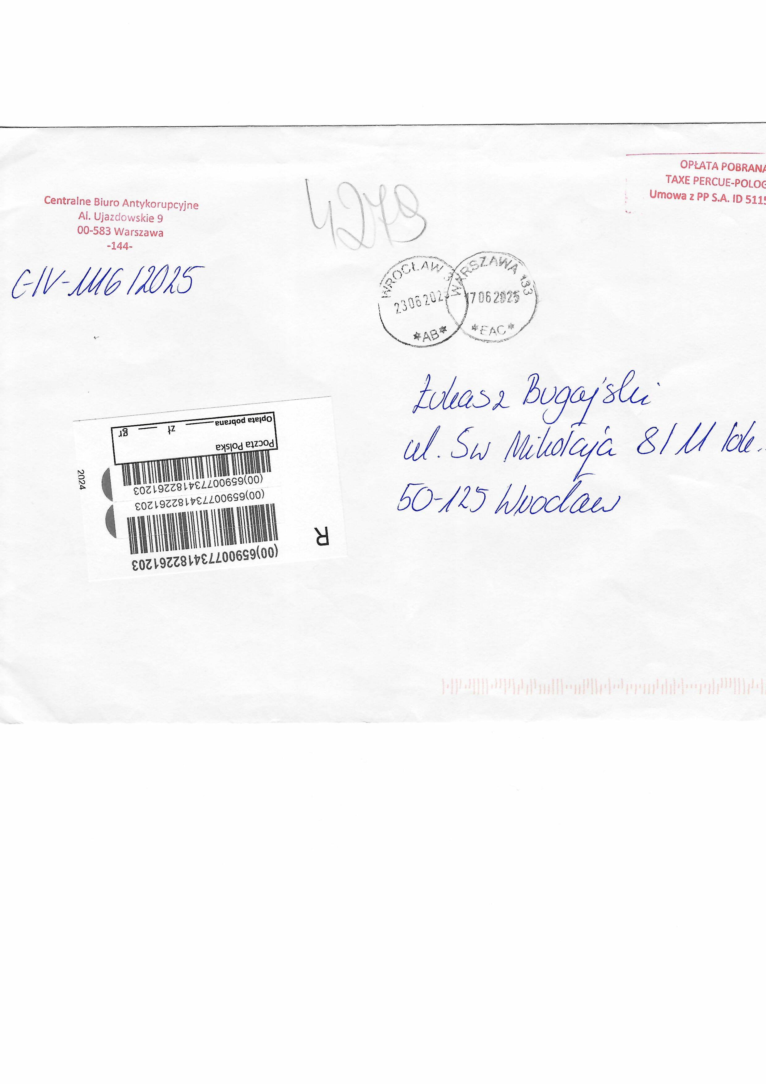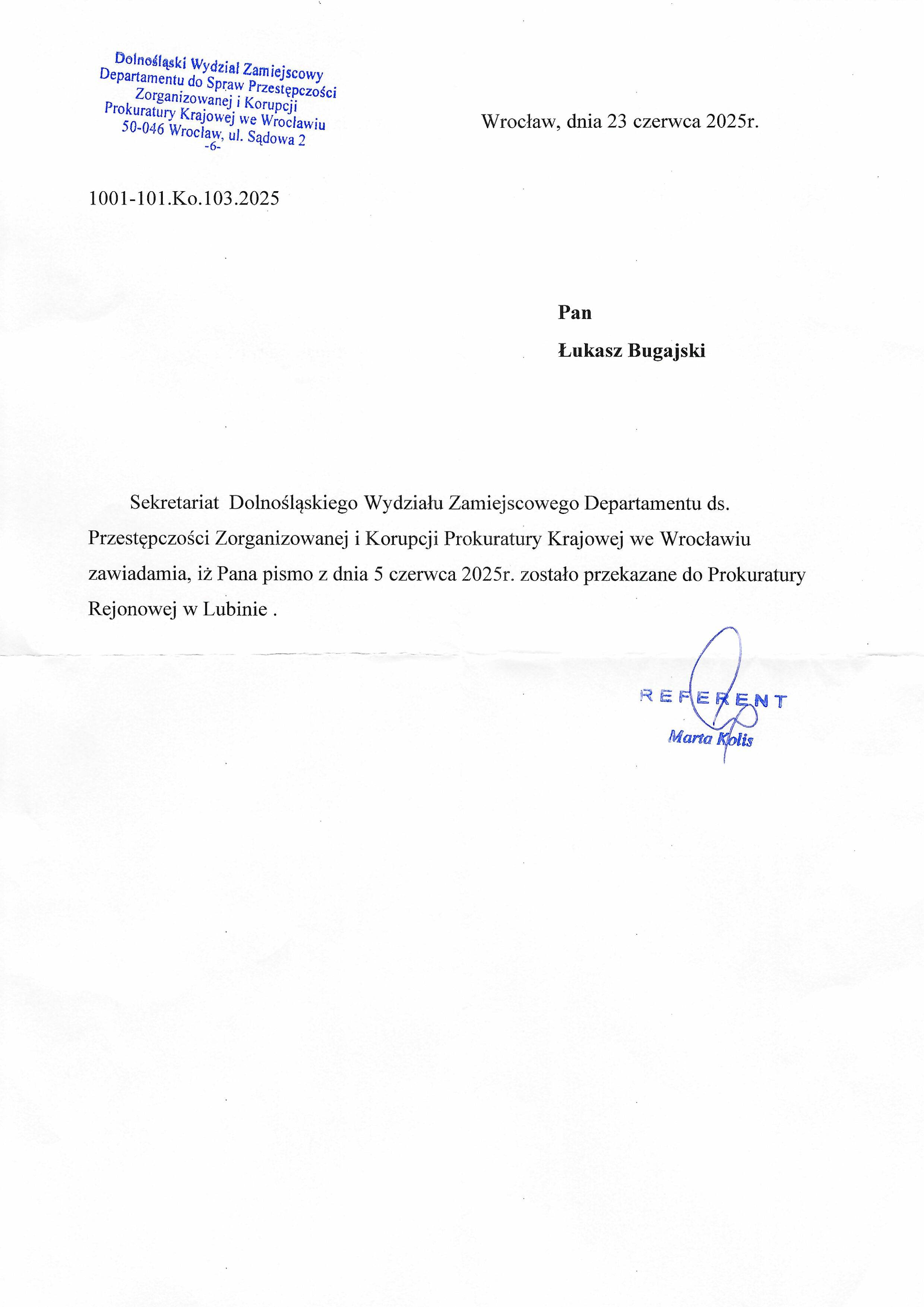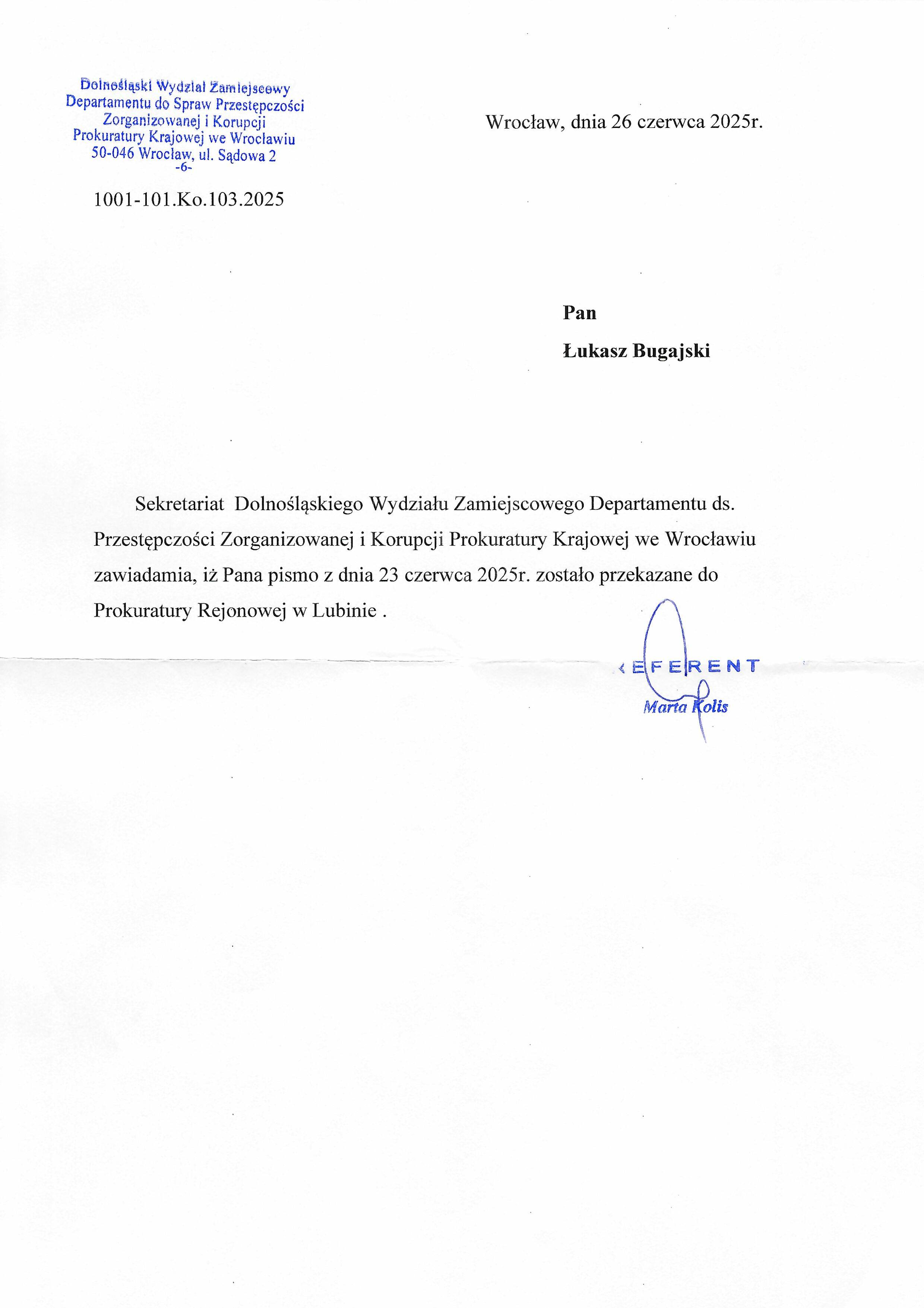 Pismo Referent Marty Kolis z Dolnośląskiego Wydziału Zamiejscowego Departamentu ds. Przestępczości Zorganizowanej i Korupcji PK we Wrocławiu informujące, że pismo Bugajskiego z 05.06.2025 zostało przekazane do Prokuratury Rejonowej w Lubinie.