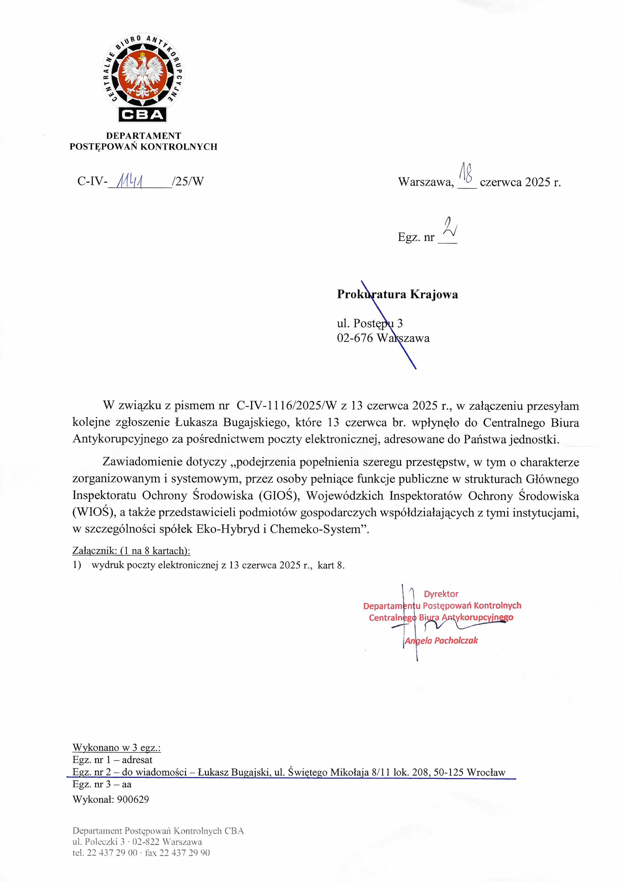 Pismo Dyrektor Departamentu Postępowań Kontrolnych CBA Angeli Pachołczak przesyłające zgłoszenie Bugajskiego do Prokuratury Krajowej (nr C-IV-1116/2025/W z 13.06.2025). Zawiadomienie dotyczy podejrzenia popełnienia przestępstw o charakterze zorganizowanym i systemowym przez osoby pełniące funkcje publiczne w GIOŚ, WIOŚ oraz przedstawicieli spółek Eko-Hybryd i Chemeko-System. Załącznik: wydruk e-mail z 13.06.2025, 8 kart.