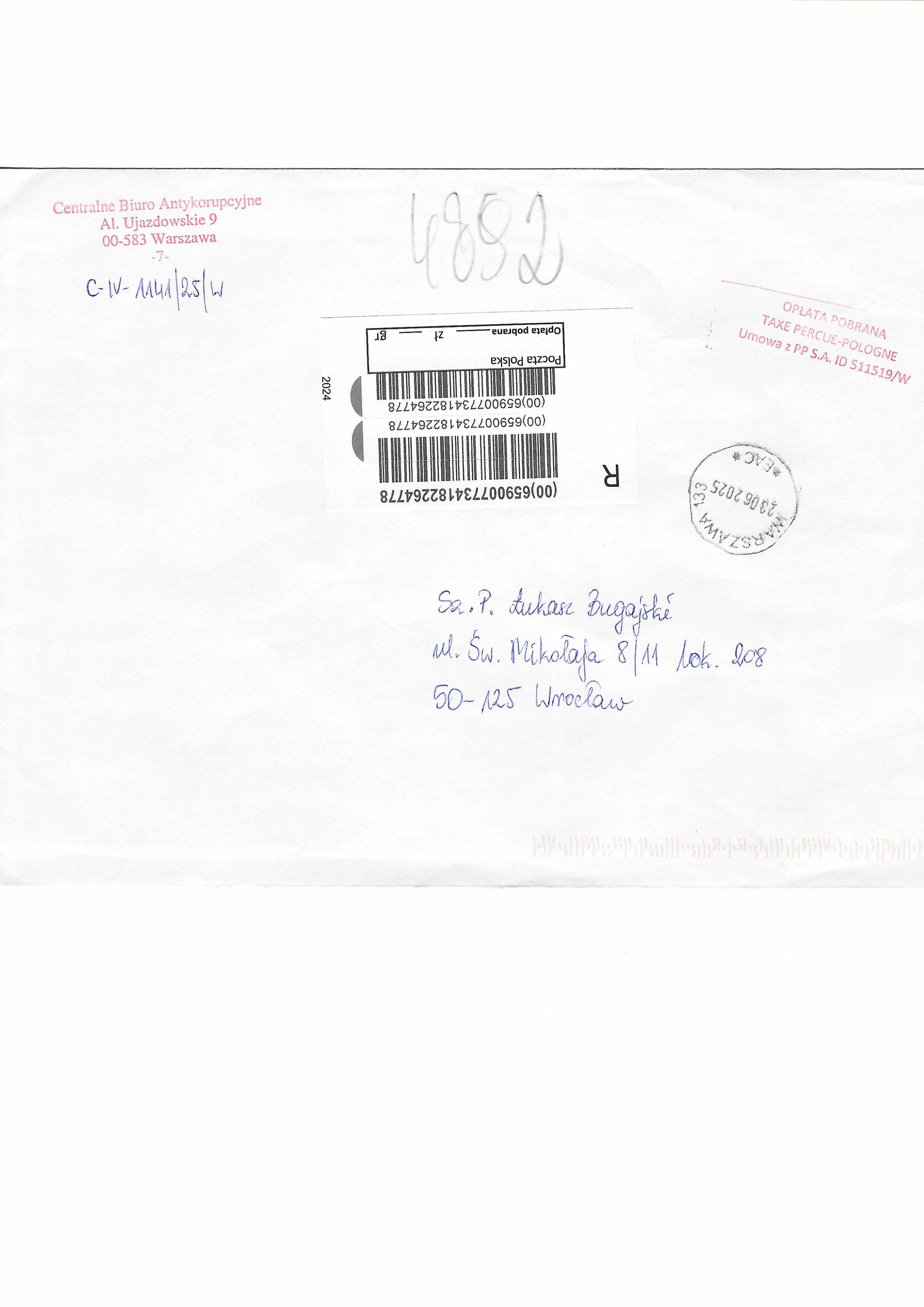 Skan koperty listu z WPA KWP Wrocław do Łukasza Bugajskiego.