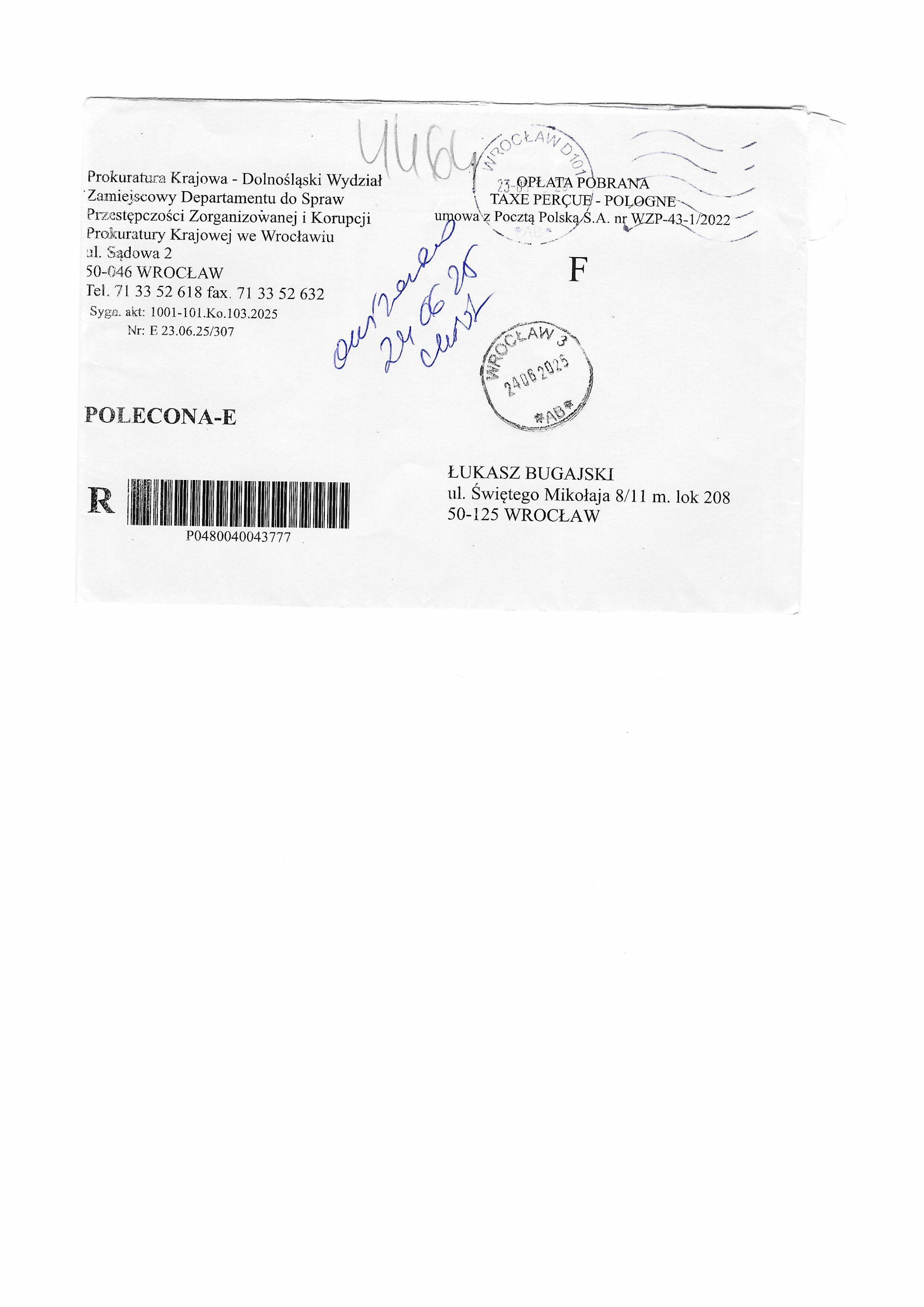 Koperta — wezwanie Prokuratury Okręgowej we Wrocławiu (28.10.2024)
