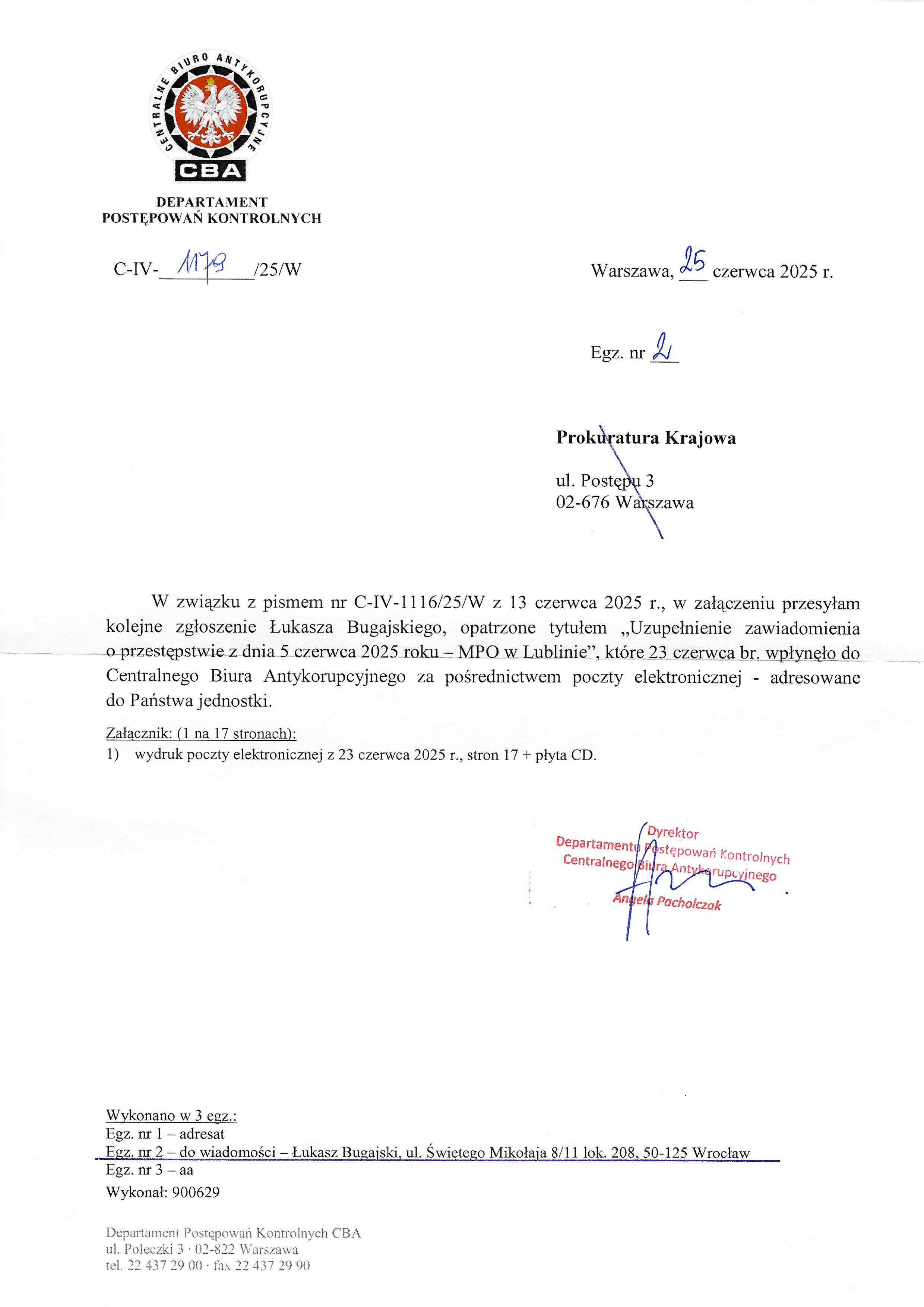 Pismo Dyrektor Departamentu Postępowań Kontrolnych CBA Angeli Pachołczak przesyłające „Uzupełnienie zawiadomienia o przestępstwie z dnia 5 czerwca 2025 roku – MPO w Lublinie" (wpływ 23.06.2025) do Prokuratury Krajowej. Załącznik: wydruk e-mail z 23.06.2025, 17 stron + płyta CD.