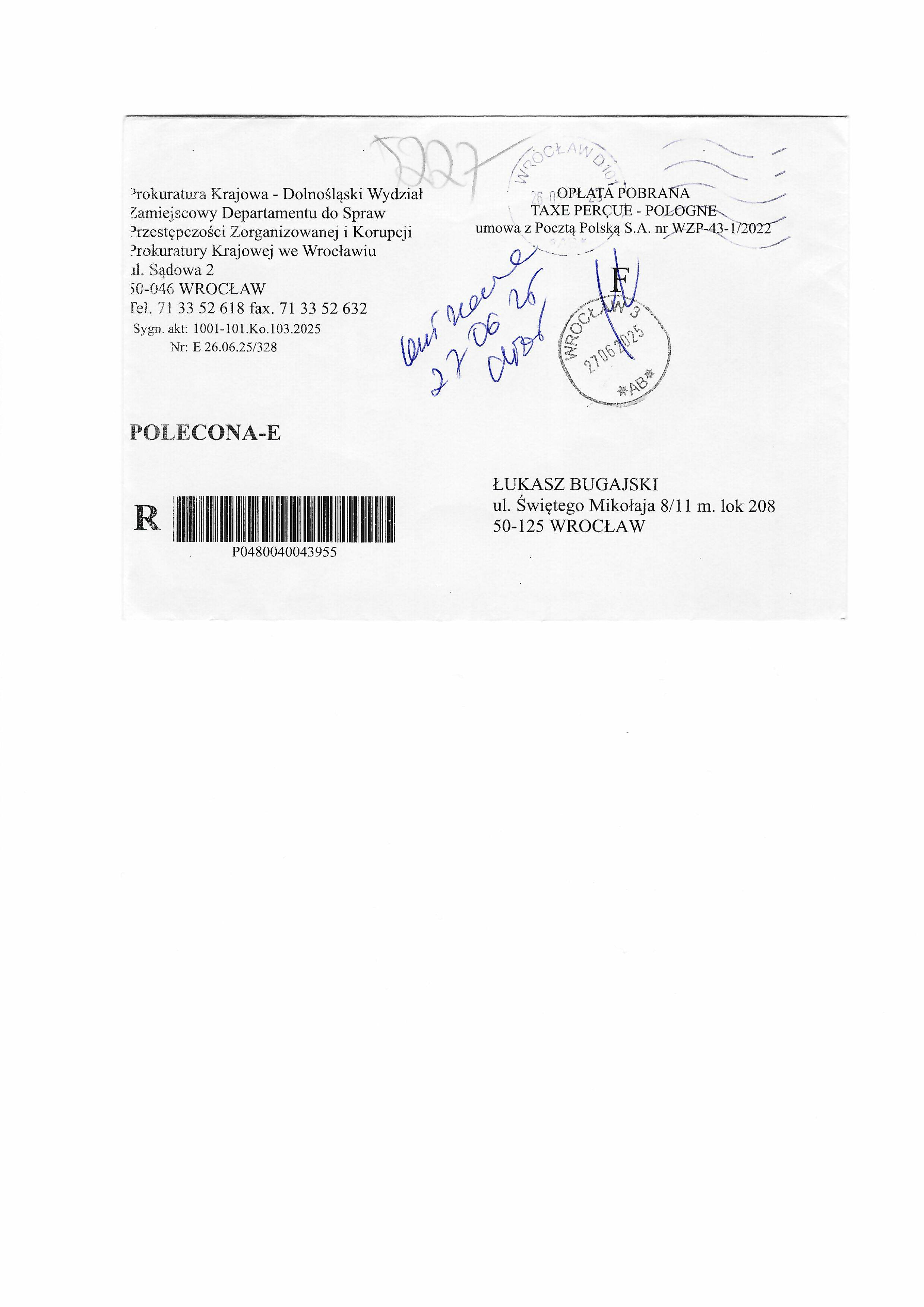 Skan koperty listu z Prokuratury Okręgowej we Wrocławiu do Łukasza Bugajskiego.